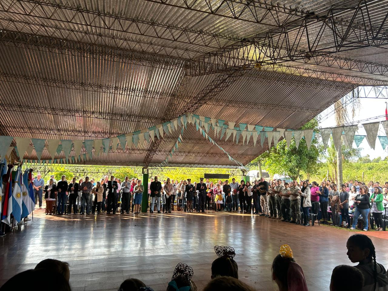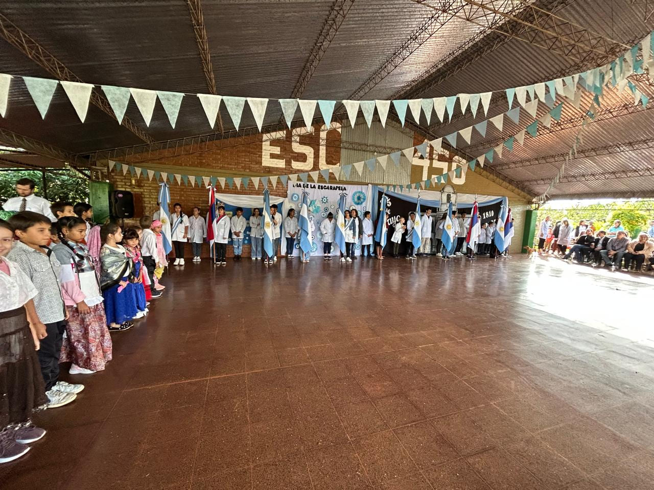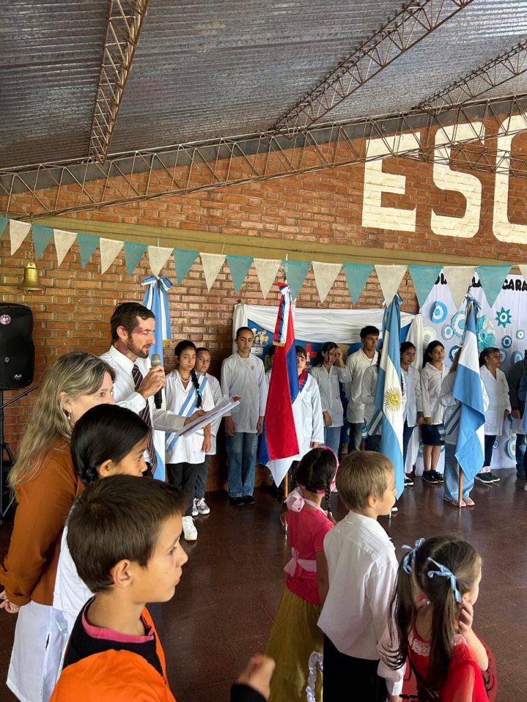 Hoy por la mañana se lleva a cabo un multitudinario acto por el Día de la Patria en la Escuela N° 450 de Cerro Moreno; donde la institución también hizo estreno de su flamante bandera de ceremonias de la Provincia de Misiones que, en nombre del secretario general de UDPM Rubén Darío Caballero, miembros de la Comisión Directiva, delegados departamentales Cainguás y miembros de la C.T.A. de los Trabajadores; han entregado a las autoridades escolares.